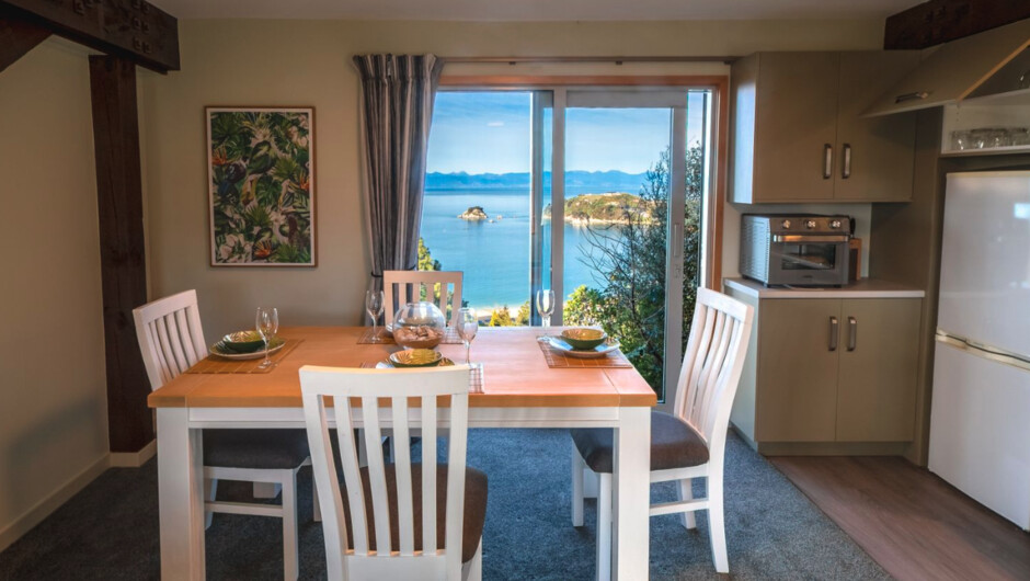 Located in the gorgeous Kaiteriteri, this studio-style, downstairs holiday unit, will have you slipping in holiday mode in no time. Welcome to Roydon's Flat. Enjoy a neutral, earthy palette of furnishes, with pops of Kiwiana décor throughout that create a warm and peaceful atmosphere, perfect for kicking back and relaxing after a day of exploring this stunning region of Aotearoa. Enjoy easy-going meal prep in the kitchenette which as a mini oven and hot plate for use, the perfect spot to whip up a delicious grazing platter for two, best enjoyed with a crisp glass of white wine on either the sun-filled deck, or at the water-facing dining table.