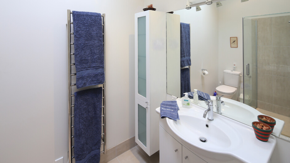 The accommodation is attached to the owners' house but has its own secure entrance and enjoys lovely views of the bay. Very well appointed with a large (21 sqm) studio with queen size bed, sofa, dining table etc and a very nice ensuite. Kitchenette with microwave oven.