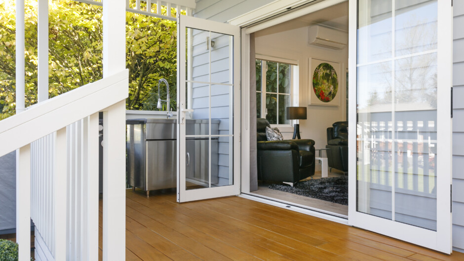 The Retreat Luxury Garden Villa offers private, contemporary, and stylish boutique accommodation, for up to two adult guests, that is separate from the main house. Inside you will find a lounge area with a Smart TV, with Sky and Netflix included, a dining area, mini kitchenette suitable for preparing breakfasts and snacks, comprising of microwave, refrigerator, dish washer and toaster, and a separate bedroom with a contemporary en-suite bathroom. Step out onto a large veranda overlooking the lawn and gardens and enjoy the morning sun, a perfect setting for breakfast. Later, relax on the sun terrace, or follow the boardwalk from the veranda to soak in the exclusive use spa pool. Bathrobes, slippers and spa towels are provided.