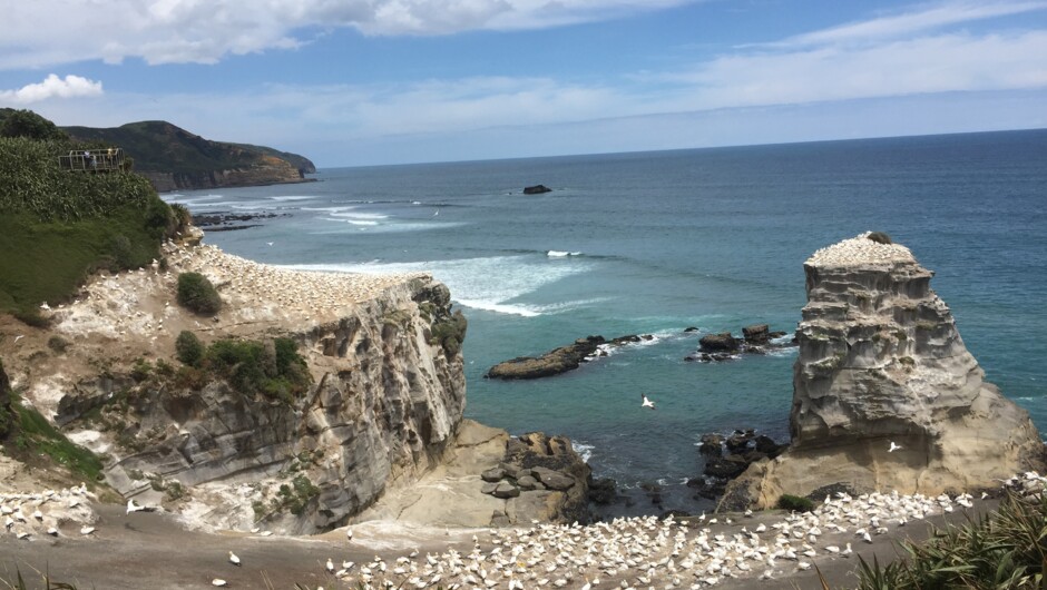 Leaving the crowds behind us we will travel through the Kumeu wine region to the wild West Coast. Enjoy the wonderful nature on a walk-through mystic rainforest before reaching the 60 km long black sand beach. Stop for a picnic with an amazing view over the Tasman Sea and if you are lucky you will see playful maui dolphins, sunbathing seals and about 3000 Gannets looking after their chicks (August-April). From here we make our way to Piha, a little seaside community. The dramatic beach is marked at each end by rugged cliffs. Lion Rock is a volcanic monolith with war memorials and Maori carvings. Nearby, Waitakere Ranges Regional Park has subtropical native rainforest and we will walk on a trail to waterfalls.