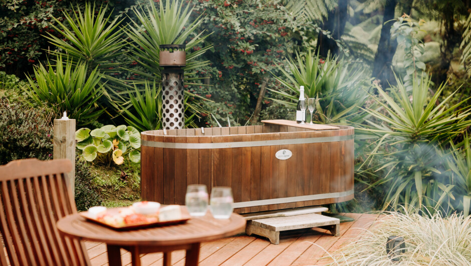 Jack's Hut is set only minutes away from the edge of Lake Tarawera and 24 minutes from Rotorua. The interior of the hut is quaint and cosy, with just enough room for a double bed, table, and chairs. Double doors open out to the spacious, covered deck. Just next door, you'll find the kitchen hut with everything you need to cook a hot delicious meal, with a Weber BBQ on the undercover deck. There's also an adjoining toilet unit and an al-fresco-style shower. To top it off, there's a luxurious outdoor hot tub, big enough for two, where you can soak your worries away. For a unique movie night under the stars, turn on the projector screen and enjoy your favourite film from the comfort of the hot tub.