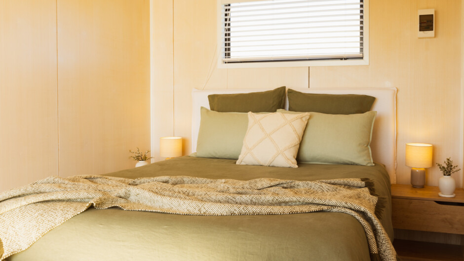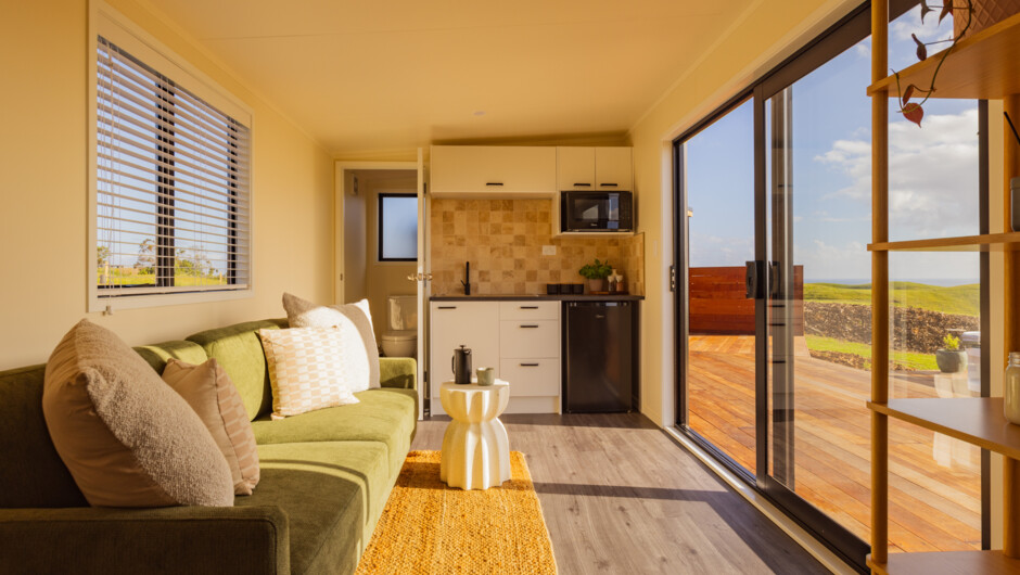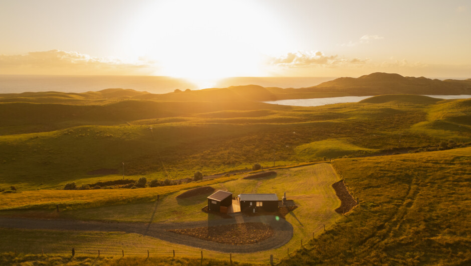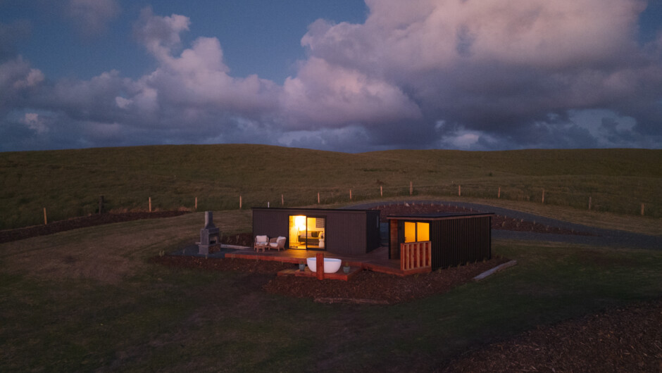 Ripiro Sunset is 30 minutes from Dargaville and 3 hours from Central Auckland. It's set on Lakeland Station, the same beautiful property as Waikare Cabin and Rotorima Retreat. The modern minimalist accommodation consists of two cabins connected by expansive decking. Inside the first cabin is a kitchen, bathroom, and lounging area. The cosy olive-green sofa offers a front-row seat to stunning ocean and lake views, while natural light pours in through the large sliding glass doors. The second cabin contains a deluxe bed, adorned with natural linens. Step out onto the inviting deck, complete with a stylish outdoor fireplace that adds warmth to cool evenings.