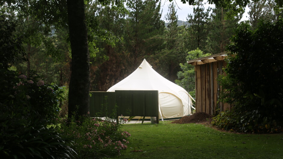 Located in a beautiful setting overlooking our forest, the Glamping Tent site is a special space consisting of a large 5m Lotus Belle tent plus a separate lounge / kitchenette for relaxing and self-contained bathroom with a toilet and shower that is forest facing and makes you feel immersed in nature. This is luxury camping style accommodation with a queen bed, quality linen, futon and hanging space in the tent, plus a well equipped camp kitchen which includes a full fridge, Weber gas BBQ, electric fry pan, kettle and toaster . The rustic lounge /kitchenette is designed for relaxing and welcomes nature indoors with fold up plastic blinds. Lean back on the outdoor beanbag, gaze up at the moonlight sky and look out for shooting stars!