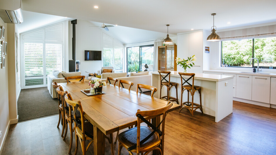 This spacious four bedroom vacation rental is less than 5 minutes walk to the lake. With a large open plan living area with full kitchen, dining area and lounge space, makes it a great options for families. Glass doors open up the space to the outdoor entertaining area, complete with alfresco dining table, umbrella and BBQ, creating fantastic indoor - outdoor flow. With plenty of off-road parking and a double garage, making this property an ideal pick for your family if you have a boat or jetski that you want to park up when you’re not out on the lake.