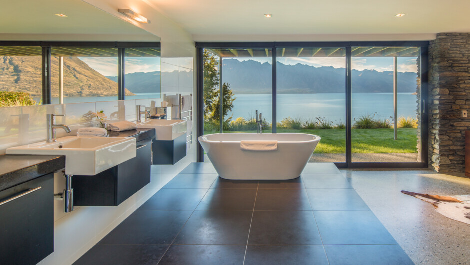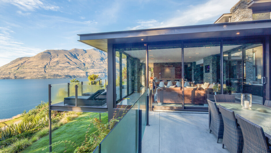 This modern and stylish luxurious villa is split over three levels with panoramic views of Lake Wakatipu and mountains. This spacious villa has two living areas, five bedrooms and bathrooms, an open fire to relax beside and enjoy cosy après ski cocktails. For summer, there is also extensive outdoor living. The villa has a spa pool, sauna and games room. Bellbrae is adjacent to a lakeside hiking and biking trail, it is a short distance from Queenstown’s bustling town centre with its award winning restaurants, cafes and designer shops.