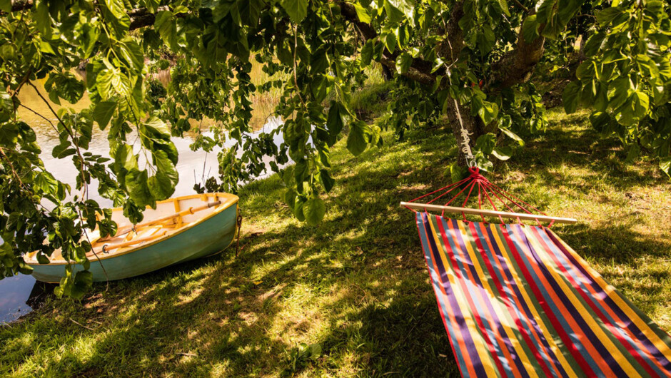 The Ark is a unique and beautifully decorated, floating house boat. It sits peacefully in a corner of a small private lake on a 16 acre property. The Ark is docked alongside a wharf where a nearby willow tree provides a cool outdoor living space - and a tranquil place to BBQ, sunbathe, read, relax, or enjoy a cool drink on a hot day. Inside is a small but perfectly formed space with an open plan and well equipped kitchen, dining, and lounge area, and bathroom. An incredibly comfortable queen size bed is accessed via a ladder in the loft.