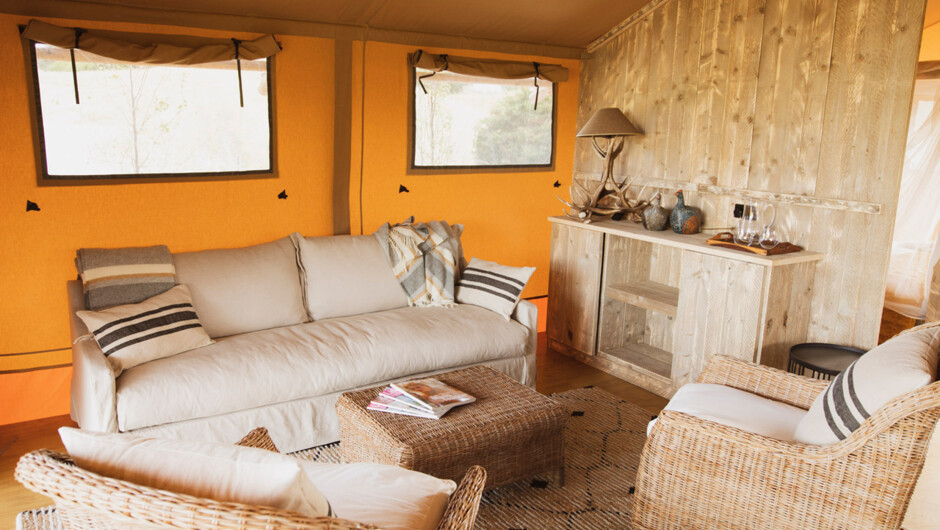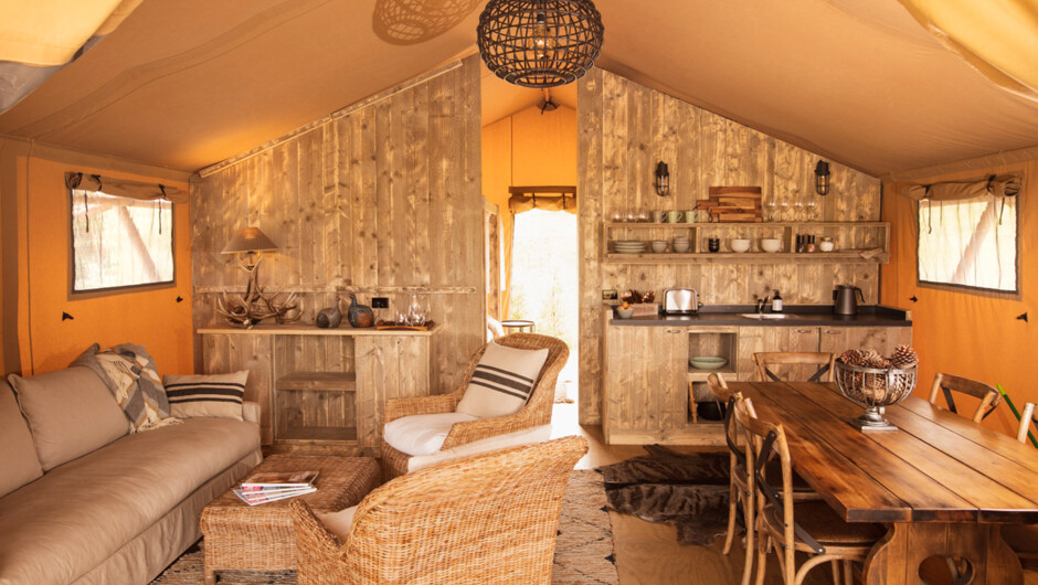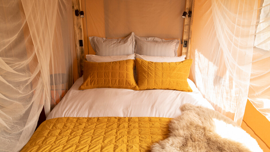 The tent sits next to a wetland lake - one of New Zealand's most rare and precious ecosystems and recognised locally as an area of special significance. Decked out with a luxurious 4-poster queen bed, a bunk room containing 3 single beds, and lots of comfortable seating - everything has been thought of for comfortable glamping. A spacious verandah to the front of the tent is a great gathering space for socialising and watching the wetland wildlife in comfort. The property is 700 metres from the beach access and 1 km from the water's edge. Head down for a swim and some beach action, or hire the Contiki and catch some fresh fish for dinner.