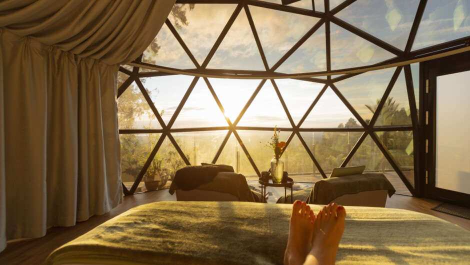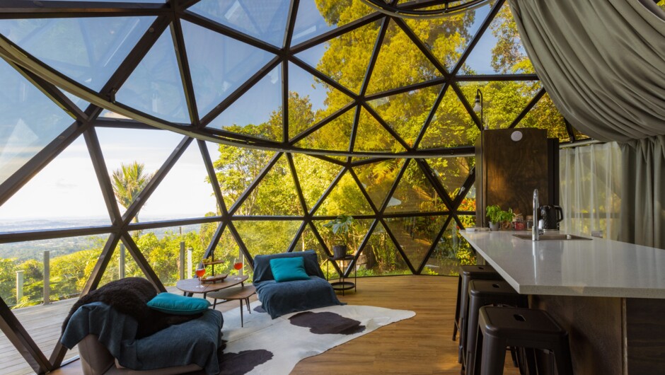Nestled 380 metres above sea level amid beautiful native bush are two stunning geodesic glass domes offering unparalleled views. The vistas overlook Auckland City, extending towards the Rangitoto Volcano, and past the shores of Waiheke.