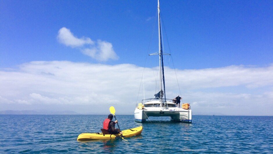 Moutohorā /Whale Island, 9km off the Whakatane coast is a kayaking paradise. We sail to the island by catamaran, enjoy two hours of paddling and visit the hot water beach and geothermal area before home baked morning tea is served on board the yacht.