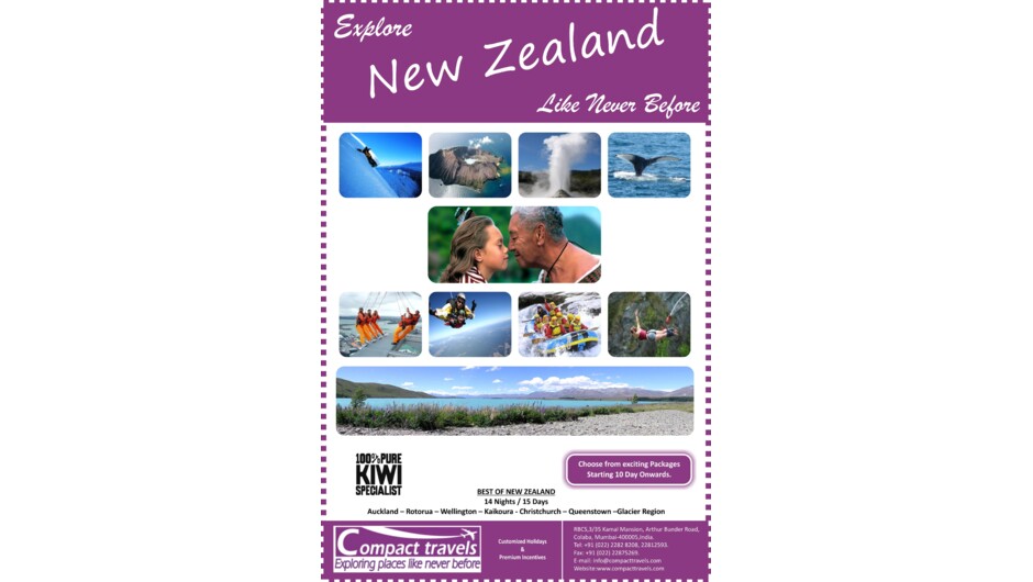 Namaste New Zealand - a website where every Indian traveller can share his experience and know more about what New Zealand has to offer. Our destination experts put their expertise to plan a customized holiday comprising of North and South Island - a scenic train journey, a self drive vacation, an adventure holiday, a memorable farm stay. From Auckland to Northland and from Rotorua and Wellington in the North Island to Christchurch, Queenstown and Dunedin in the South Island as well as the Glacier Country, Namaste New Zealand can put together unique itineraries and experiences for you. What are you waiting for? Get in touch with www.namastenewzealand.com and start exploring New Zealand like never before.