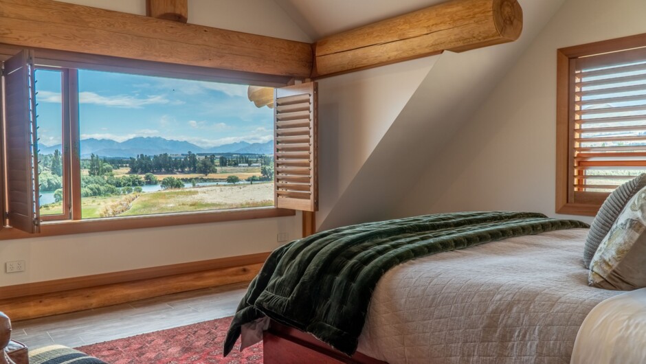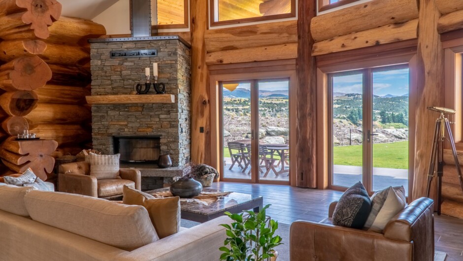 A unique handcrafted log home built from Canadian cedar, set on a ridge overlooking the Clutha River and the snow-capped peaks of the Southern Alps.