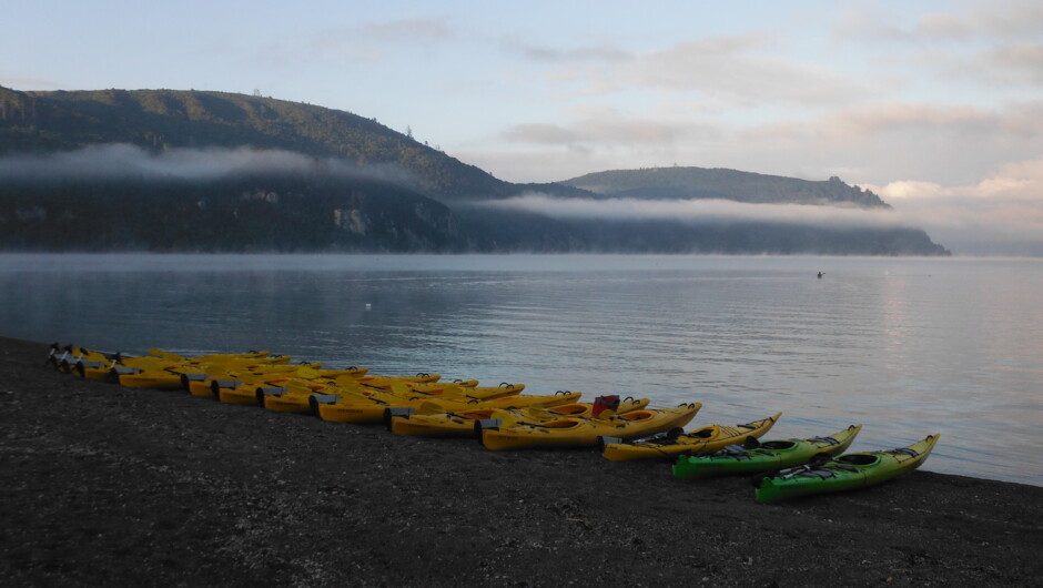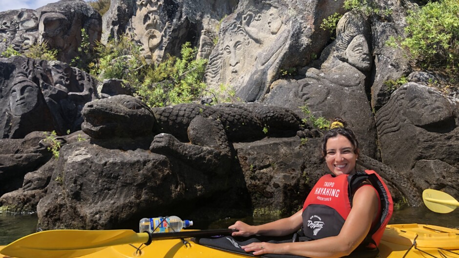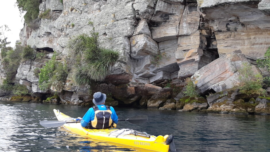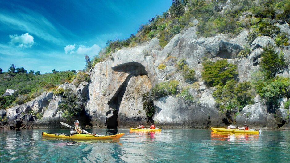 We'll begin our adventure in the sheltered waters of Acacia Bay. We paddle below native bush, pass steep cliffs and inlets that can only harbour a kayak, then prepare to be wowed by the Maori Rock Carvings towering high at Mine Bay.
