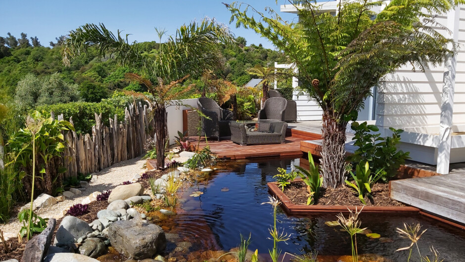 Escape to the beauty and tranquility of Golden Bay. Our elevated location offers you an all-day relaxation with native birdsong and unsurpassed sea views. Laze on your private deck to soak up memorable sunsets, unwind in our outdoor spa and swimming pool or tramp the most beautiful part of the Abel Tasman Coastal Walk.
