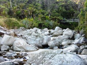 まずはコファイやキャベッジツリー、ニカウヤシの茂る降雨林の中をヒーフィー川に向かって少しずつ下っていきます。 途中、少し寄り道してニュージーランドの最大のラタの木を見ていきましょう。川の上流域には、全長148mの大きな吊り橋があり、河岸平野と川の流れを見下ろすことができます。河口に向かって下りていくうちに、ニカウヤシが目立つようになり、絶え間なく押し寄せる波のとどろきが聞こえてきます。潮や風向きによっては、川を逆流する波が見えることもあります。ヒーフィー・ハットは強風の影響を避けて、海から離れた場所に設置されています。