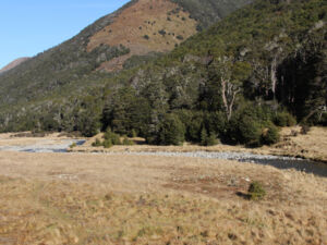 カンニバル峡谷にかかる吊り橋を渡り、右岸側に入ってから6kmほど歩くとカンニバル・ゴージ・ハットがあります。ハットを過ぎるとマルイア川沿いの歩きやすい道が続きます。ブナの森林と開けた草原(雪崩に注意)を抜けると、エイダ・パス・ハットです(3km、30分)。