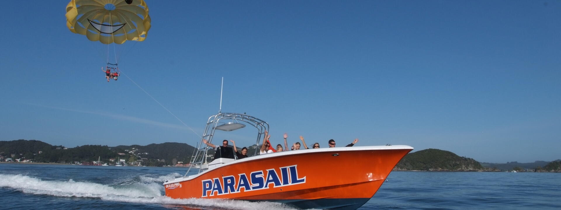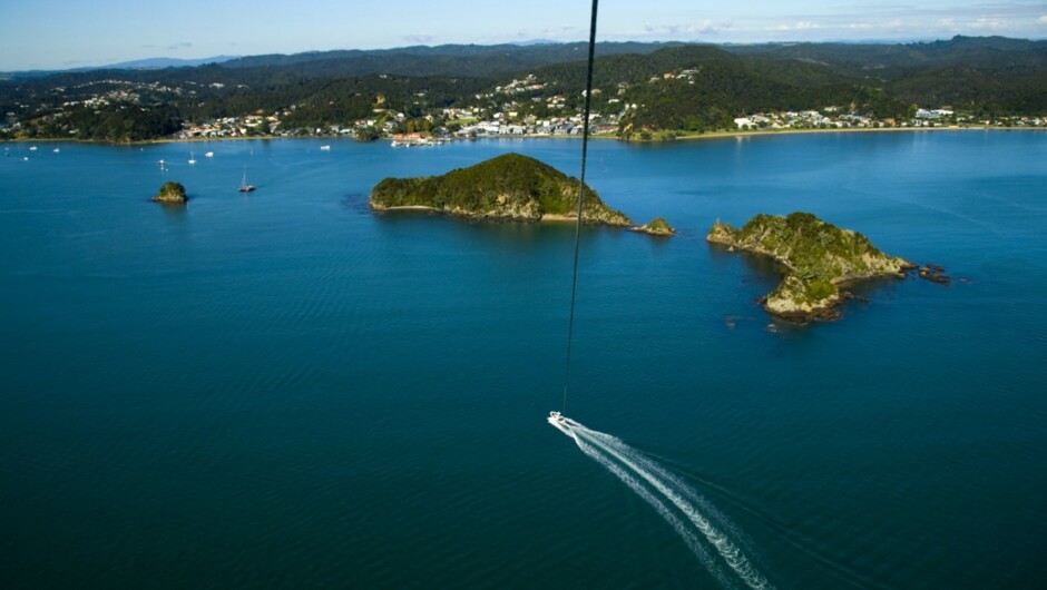 フライング・キーウィ・パラセイルはニュージーランド随一の高度を体験できるパラセイリングを提供しています。経験不要、特別設計のボートの後部デッキからふわりと宙に浮きます。ノースランドとベイ・オブ・アイランズの絶景をのんびりと楽しんでください。上空1300フィートで逆さまになるスリルを味わえるオプションもあります。スキッパーもクルーもとてもフレンドリーな明るい人たちで、徹底した訓練を受けています。安全記録は100%、 管轄機関の規定を遵守しています。MOSS認定、天候に応じて通年催行しています。