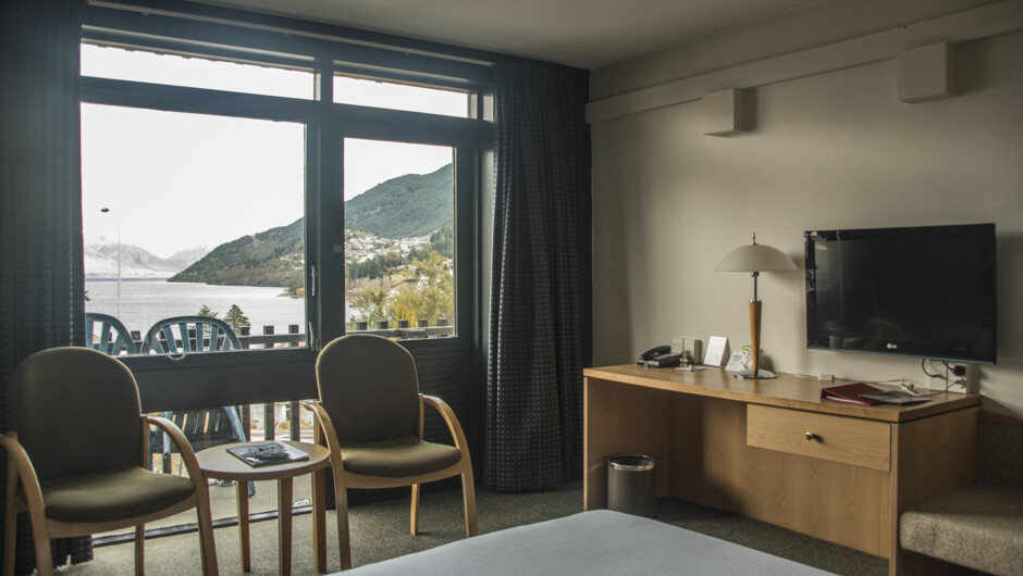 クィーンズタウンでも最高の立地にある気さくな雰囲気のホテルです。スイス風の外観が特徴です。