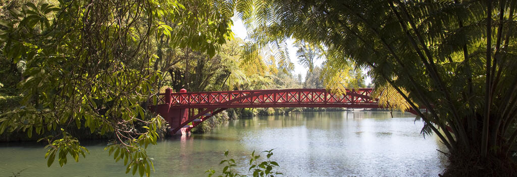 뉴플리머스의 자랑인 푸케쿠라 파크에는 광활한 정원, 연못 정원, 전시관, 공연장이 있다.