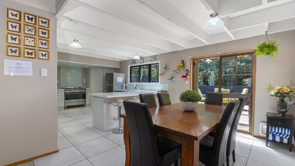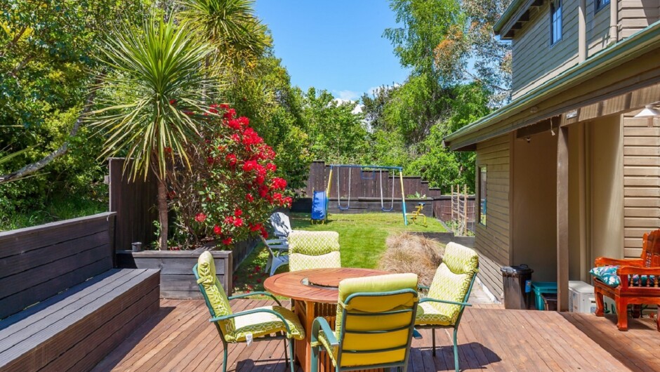 Nestled in the corner of the large sun-deck is the hot tub, which is the perfect spot to relax while the kids make use of the fully-fenced yard. The outdoor area is an entertainers dream – so fire up the BBQ and enjoy the sunshine & privacy. With a large modern kitchen, 4 bedrooms, 2 bathrooms, large lounge plus additional smaller lounge/sitting area & dining area. There is a heat-pump, underfloor heating (in the kitchen) & pellet fire to keep you toasty during the winter months. Bedding, towels, WIFI, and exit clean are included in your nightly rate.