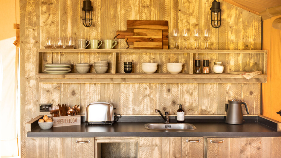 The tent sits next to a wetland lake - one of New Zealand's most rare and precious ecosystems and recognised locally as an area of special significance. Decked out with a luxurious 4-poster queen bed, a bunk room containing 3 single beds, and lots of comfortable seating - everything has been thought of for comfortable glamping. A spacious verandah to the front of the tent is a great gathering space for socialising and watching the wetland wildlife in comfort. The property is 700 metres from the beach access and 1 km from the water's edge. Head down for a swim and some beach action, or hire the Contiki and catch some fresh fish for dinner.