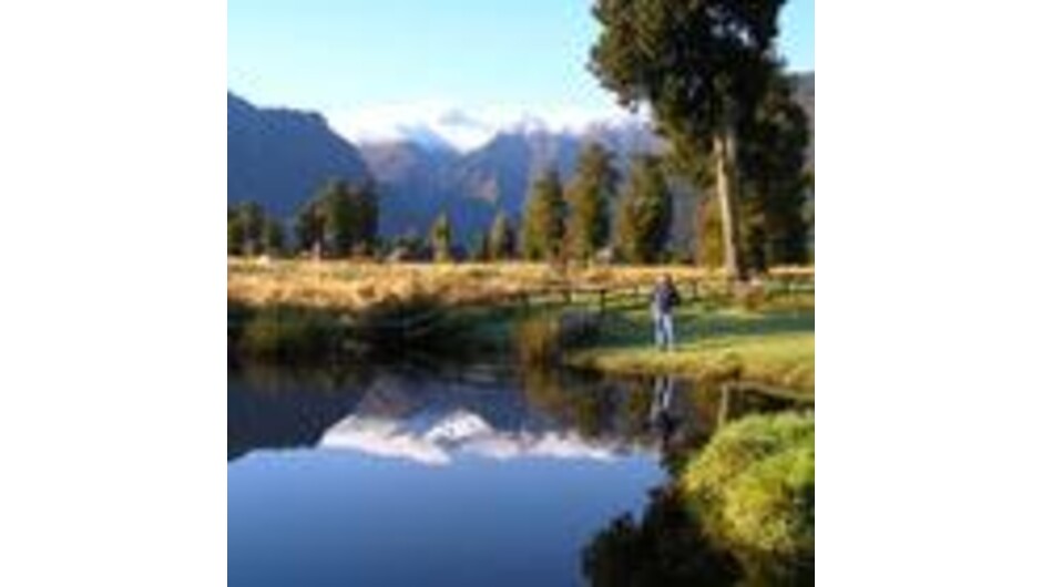 Just 3 kilometers from Fox Glacier township, my home is situated on 8 acres with spectacular views of Mt Cook & Mt Tasman, towering above the Fox Glacier Valley. I have a reflection pond which gives some wonderful photo opportunities, or you may visit Lake Matheson just a short distance away, which is one of New Zealand’s renowned mirror lakes.