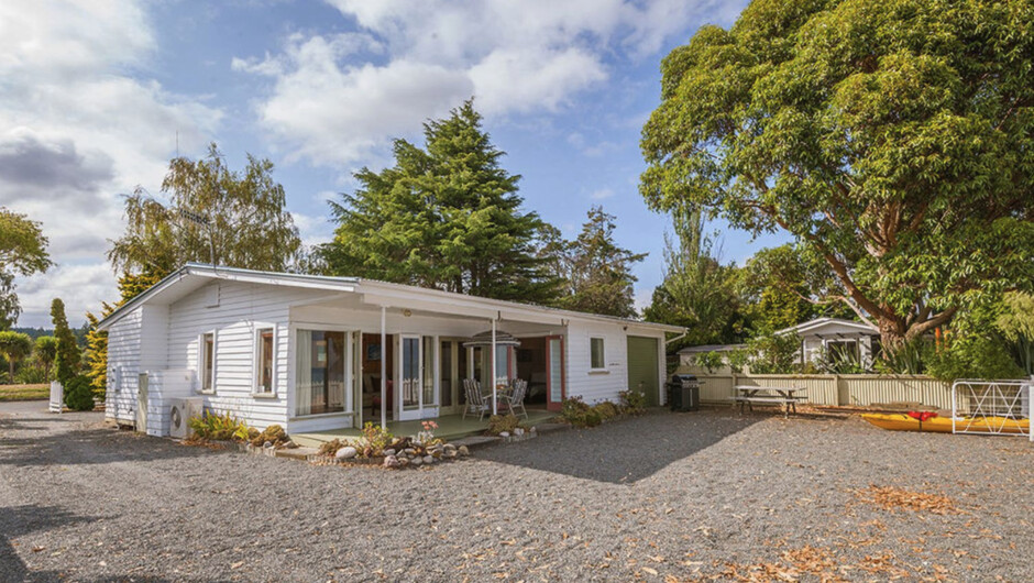 Lake Edge Cottage is a rustic 2 bedroom absolute lakefront Waitahanui bach! With gorgeous views and fantastic position, this basic kiwiana bach is a great base for your next Taupo getaway as only 12 minutes drive to central Taupo.
