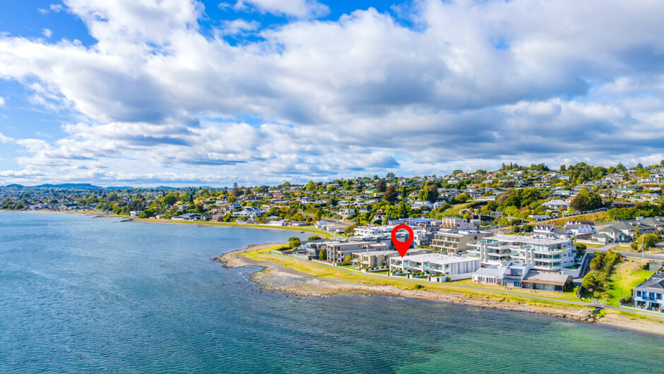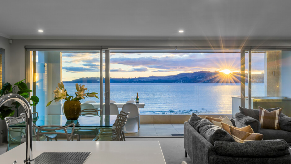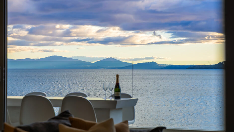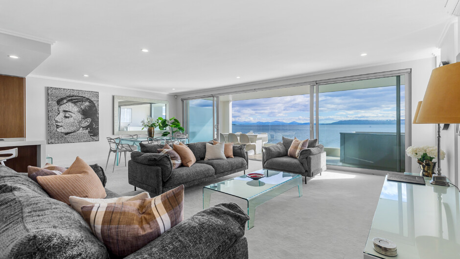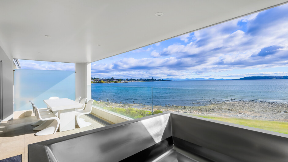 This Lakefront apartment has to be seen to be believed. Featuring panoramic Lake Taupō views from the floor to ceiling windows, a geothermal tub and outdoor dining on the balcony.