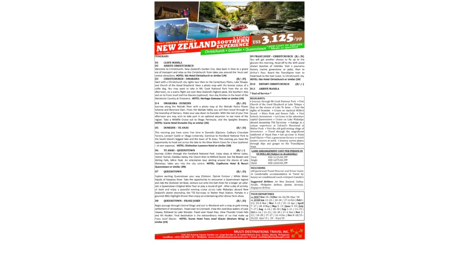 Our company has been in operation for 25 years and New Zealand is among its vacation holiday destination. Private or exclusive tours are available upon requests while a Sit-in-coach comprehensive program is available with fixed departure dates. Its called Discover New Zealand. Special departure dates for customized itineraries according to your need can be prepared upon request. To make your trip hassle-free we will assist you in processing your temporary visitor's visa to NZ. Once you are set to go, we will provide you with a pre-departure orientation . You will be received by Our highly qualified ground partners with well equipped deluxe coaches , well trained guides and reliable hotels/resort partners. Call us !