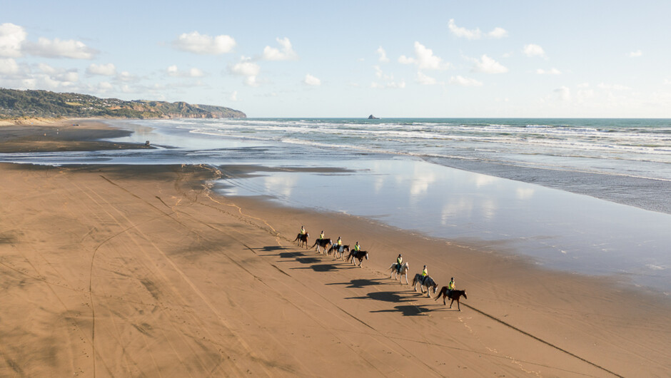 After meeting your friendly guides, you will be matched with your steed. After a short safety briefing, you will experience the black diamond sprinkled dunes of Muriwai Beach and take in the landscaped vistas and sweeping waves. You will hardly believe you are on the outskirts in Auckland. This trail is truly memorable and is suitable for every level but especially beginners, all riders must be a minimum of 5 years old and under 95kg (unless agreed upon prior to booking). Feel supported by our experienced guides who often walk on foot to help you along the way.