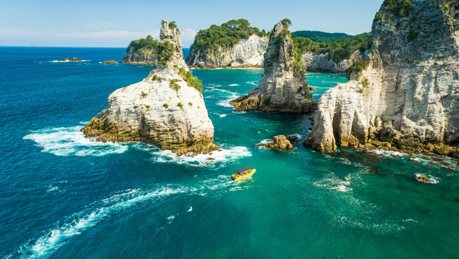 Join us to discover 12 km of rugged volcanic coastline visiting nearby islands, stunning beaches, including Lonely Bay, Cooks Beach, Hahei and the spectacular Cathedral Cove where Prince Caspian (Chronicles of Narnia) was filmed. Venture across the Te Whanganui-A-Hei Marine Reserve where you’ll observe an abundance of marine and bird life. Get up close and personal with towering pinnacles, giant blowholes and huge sea caves including Orua Sea Cave, one of the largest in New Zealand and only accessible by boat. Throughout the tour your local guide will highlight Mercury Bay’s rich and colourful history giving a fabulous balance of information and time to soak up the sights and sounds.