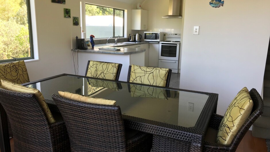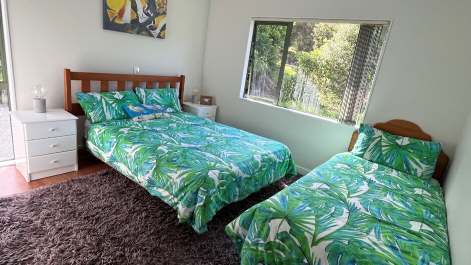 Downstairs open plan living areas, Bedroom with double and single bed. Separate bathroom and laundry. Large deck with Weber BBQ. Great entertainment inside and outside with amazing views. 80 metres from house to Wharekawa Harbour and boat ramp. Relaxation - birds at sunrise and moreporks/ruru at night. House up private road culdesac 1700M2 site. Master Bedroom view Sunrise over water. WIFI, Sky TV 2 Flatscreens. Sunny. Great for children. 6 km sandy forest, private beach view of Slipper Island.