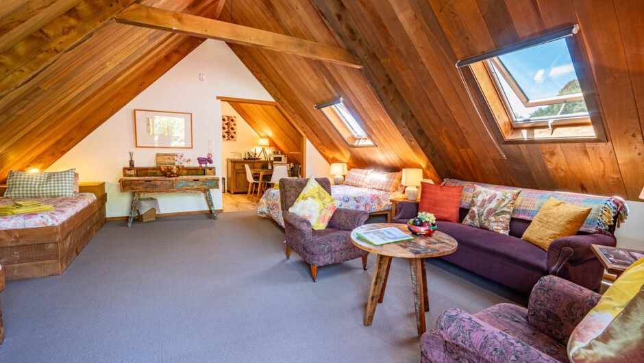 This upstairs self-contained loft is a haven for relaxation, providing everything you need for a delightful stay. While it's the perfect romantic retreat for couples, the loft can comfortably accommodate up to four people. The vibrant and cheerful interior features a full queen-size bed, two single beds, a lounge, dining area, and a well-equipped kitchen, complemented by a spacious modern bathroom.