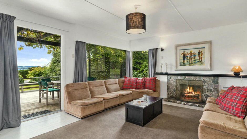 This bach enjoys sunny, open-plan living that flows seamlessly onto the sundeck framed and sheltered by the surrounding vines. Here you can sit back, relax and watch the world go by. With plenty of outdoor seating, in the warmer months, soak up the sun and enjoy a laid-back BBQ with your group. You can also enjoy a bath with a view on the deck. During winter stays cosy up by the fireplace in the lounge, chill out in front of the large Smart TV, or enjoy the additional warmth with the pot belly fireplace in the dining space. You’ll love the close proximity to the Lake, just a 2-minute walk away, where you can stroll along the water’s edge and take in the expansive views of Lake Taupo.