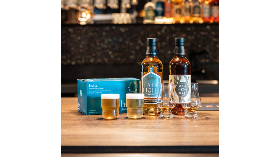 A perfect tasting flight that shows off the beer & whisky made here. Waiheke Whisky Fairlight Blended Whisky, Waiheke Whisky Oak + Rye American style, Waiheke Waiheke Brewing Co's Heke lager premium lager & APA. 15ml x 2, 160ml x 2. Most days this will be guided for you in our luxe Boilermaker Bar, on occasion this might be served in our cellar door restaurant due to operational requirements.