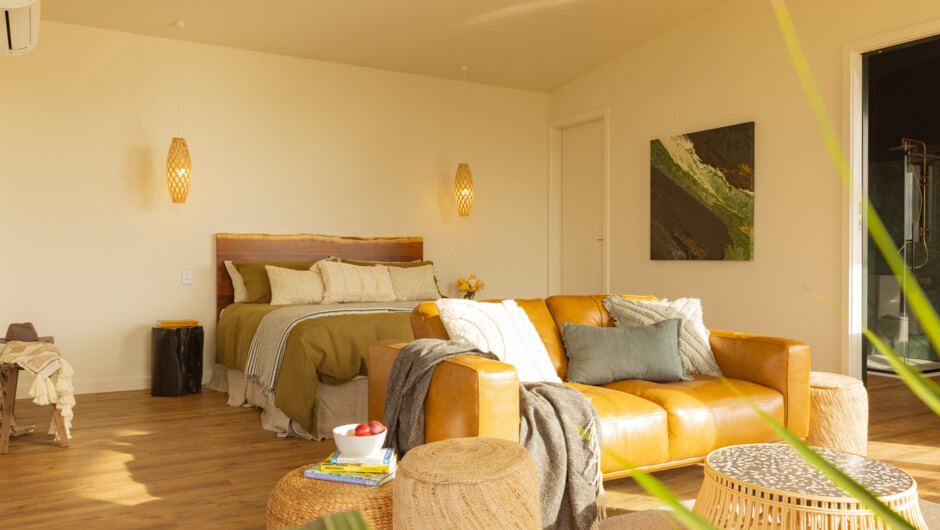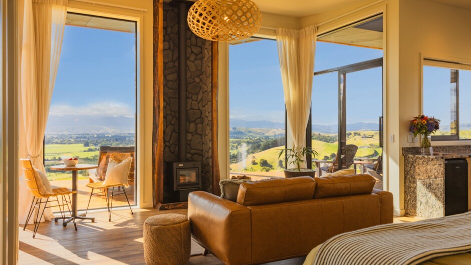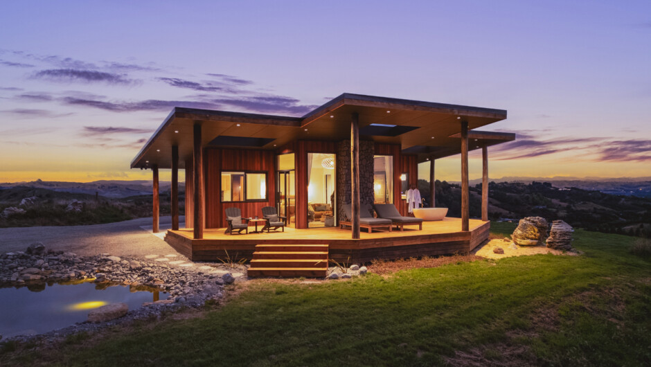 Fossil Hill is just 10 minutes from Masterton in the Wairarapa and 1 hour 40 minutes from Wellington city. From this elevated spot, take in breathtaking 360-degree views over the Wairarapa landscape, where the Ruamahanga River winds below the Tararua Ranges, and Mt Rangitūmau and Mt Bruce rise among rolling farmland and regenerating native bush. The cabin itself is a masterpiece of craftsmanship. Reclaimed timber adds character throughout the open-plan space, where living, cooking, and sleeping areas flow together. Beneath the outdoor skylights, soak in the deep stone bathtub while gazing at the stars above. As dusk falls, watch as the pond reflects the fading light and sheep graze peacefully in the meadow.
