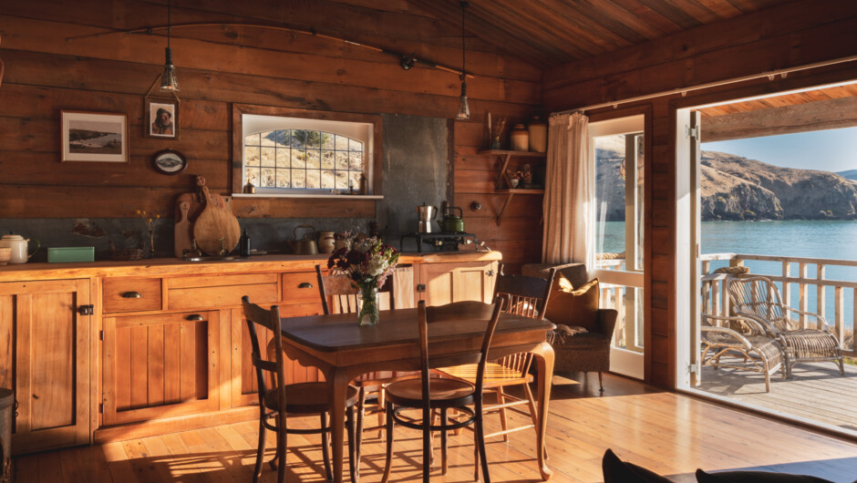 Steeped in history, this hut was originally built during the Depression in the early 1930s. It is still clad in the original flattened kerosene tins. Now beautifully restored, in keeping with its era, the hut is filled with old worldly charm. It features two bedrooms - ‘The Captain’s Room’ with an oceanside view. The cosy lounging space is thoughtfully embellished to complement the surroundings and history. Winter days call for the glow of the fireplace, a wool rug, and hot tea as you snuggle in with your favourite novel. The deck overlooks the water, allowing you to relax to the soothing sounds of the waves, and watch the boats as they come and go, as do the tides. If you’re lucky, the Hector Dolphins and Orcas may just grace you.