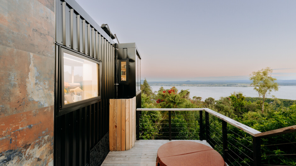The 30 sqm tiny house has been cleverly designed with adjoining living spaces and an expansive deck. A kitchen, dining and lounge space make up the living area. The raised seating space faces east - and offers a sweeping view across Lake Taupō and to the Kaimanawa Ranges. The main bedroom has a queen bed and an opening door to the deck, ideal for enjoying the crisp morning air with a hot tea. If you’re looking for an ‘alfresco’ touch, you can enjoy an outdoor shower by sliding the big glass doors open to the deck and the lake views. Listen to the dawn chorus of fantails, tuis, kereru, and bellbirds as they sing you awake. In the evening soak in the outdoor hot tub & take in the twilight views. And as darkness falls, light the outdoor fire.