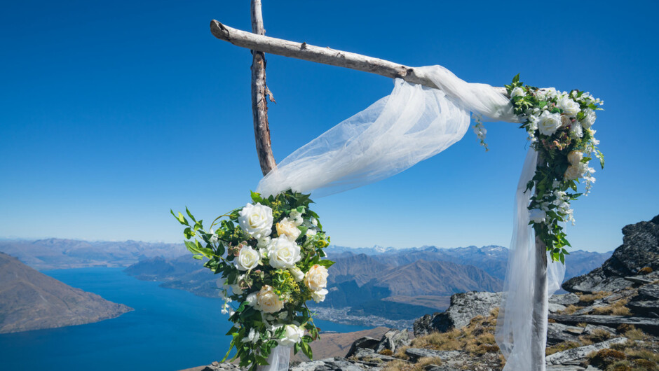This wedding is hosted about elevation of 3000 metres high, hugged by white clouds, snow under your feet, the moutain range and sky are your witness. Yes, it is undoubtedly high class, 3000 metres high. The package defaulty includes: 1 Wedding Dress+1 Man's Suit, including accessories Helicopter Booking($1100-$1600, limited location) Wedding Arch+Artificial flower and Veils decoration Registry Table and Chair/Stoo; Sparkling Wine Artificial Bouquets+Buttonholes Music for wedding march