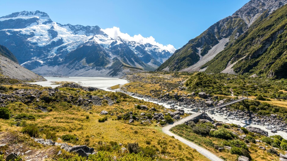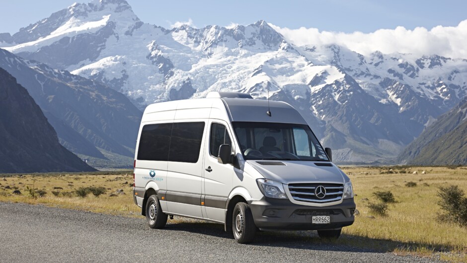 Your tour begins with a scenic drive through Kawarau Gorge, followed by a stop in Cromwell to sample local fruit. Travel along Lake Dunstan and through the remote Lindis Pass before reaching the vivid alpine lakes near Omarama. Soon, Aoraki Mt Cook -New Zealand’s tallest peak comes into view, rising above the vast McKenzie Country. Enjoy panoramic views, with optional scenic flights over glaciers for an unforgettable aerial perspective (weather permitting). Relax over lunch at the Hermitage Hotel before returning to Queenstown, taking in more stunning scenery and insights from your guide along the way.