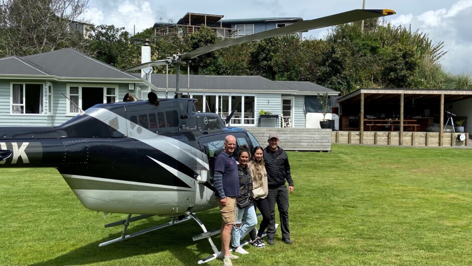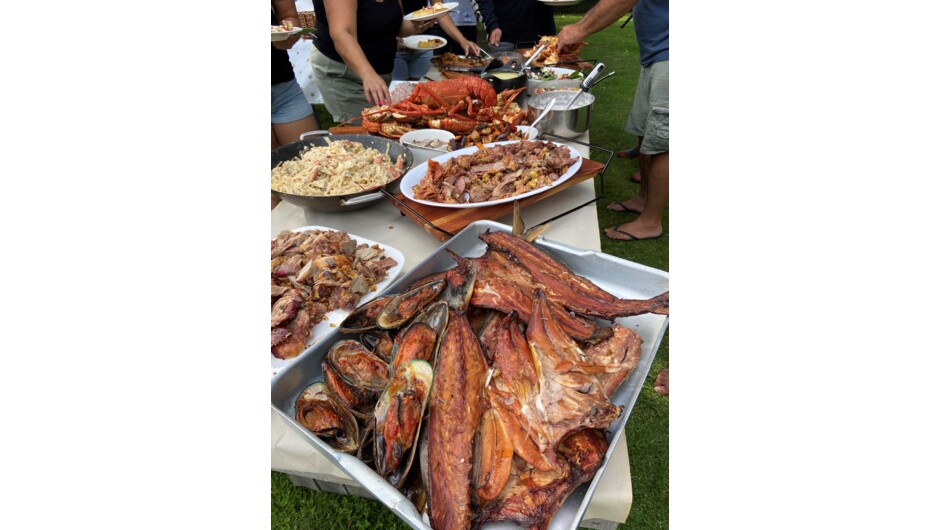15 minute scenic heli flight from Tauranga Airport to Maketū, including Mauao & coastline. 45 min cultural introduction to Maketū including local storytelling & visits to tribal landmarks. 3 hour ocean adventure onboard a 6.45m custom built Extreme Game King, including fishing rods, tackle, bait, light food & refreshments. 3 hr hands on interactive & feasting experience - assist to unearth the hangi pit, learn to fillet fish, prepare crayfish, shuck mussels & kina, eat straight from the shell. Home hosted experience for a Kai Hākari (feast) including hāngi (beef, lamb or pork, chicken, kumara, potato stuffing, steam pudding) salad, seafood, fried bread & beverage selection. Receive a Taonga (gift) as a keepsake. Private transport included.