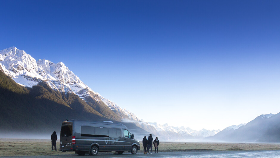 Travel in luxury and ultimate comfort in our 18-seater Mercedes coach. With air conditioning in Summer and heating in Winter, you will be comfortable taking in the spectacular scenery through extra large viewing windows. The small seating capacity allows for more time to do extra photo stops and small walks on your trip to Milford Sound.
