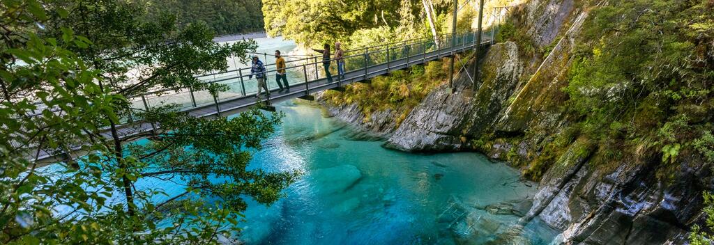 Take a short and easy walk through mature beech trees and over a swing bridge to discover the awe-inspiring Blue Pools. The deep, clear glacial pools of the Makarora River can be found in Mount Aspiring National Park.