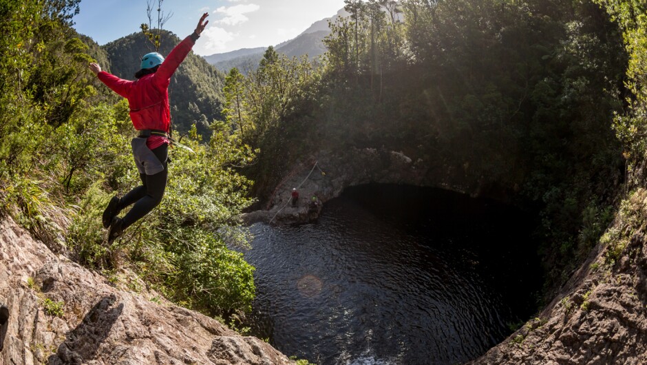 Canyonz offers one of the biggest, most exciting and challenging adventure activities in Aotearoa. Spend an unforgettable day in the magical Sleeping God canyon. The Sleeping God trip is a vertical descent over 300 metres down a steep set of waterfalls involving abseils/ rappels of up to 75m, zip-lines, exhilarating water slides, and big jumps into deep pools that are guaranteed to thrill. Jumps are optional, abseils are not. The full day trip departs at 8:30 am and returns around 6 pm. The half day trip departs at 9.30 am and returns around 3 pm. Professional guides, all equipment, lunch, and sausage-sizzle are included along with free photos. Book now.