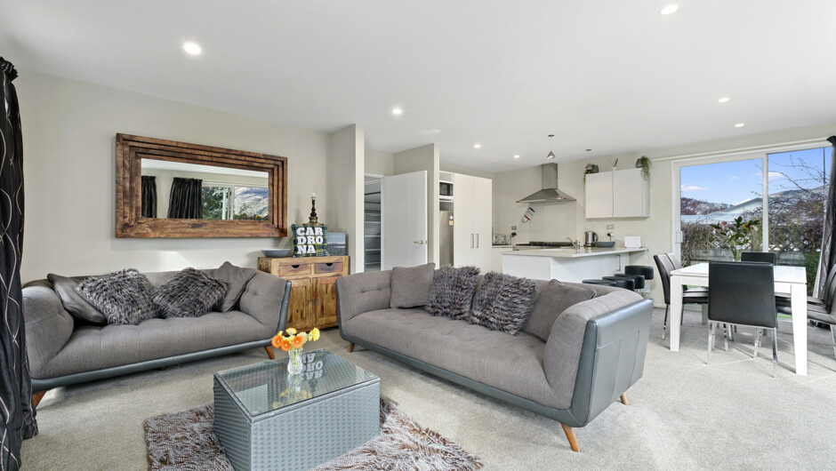Hunter's Retreat is an ideal spot for any group getaway to beautiful Wanaka. When it’s cold outside, keep cosy and warm next to the gas fireplace. Make a coffee and grab a book, switch on the tele, or log into the WIFI and post the photos from your day’s adventures at Cardrona. And when those summer temps hit, switch on the air-conditioning and chill. A fully equipped kitchen offers every opportunity to cook up a storm, or head out on the patio and throw some delicious local produce on the BBQ. A dining table in the open-plan living space is waiting to seat the whole family, or go Kiwi style and dine alfresco. Five bedrooms here at Hunter's Retreat comfortably sleep up to 10 guests, with king, queen, and bunk bed options.