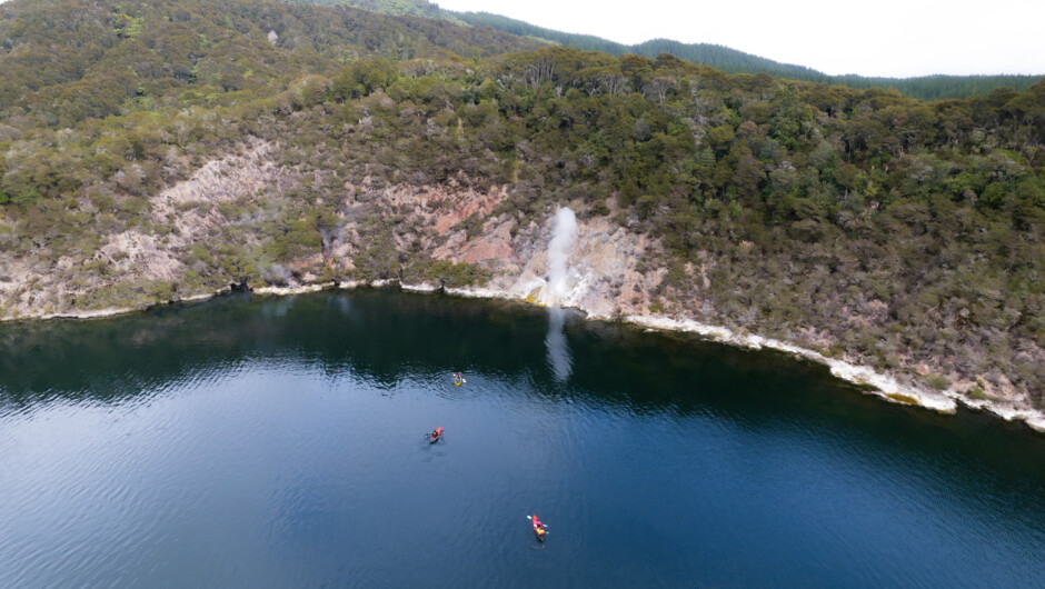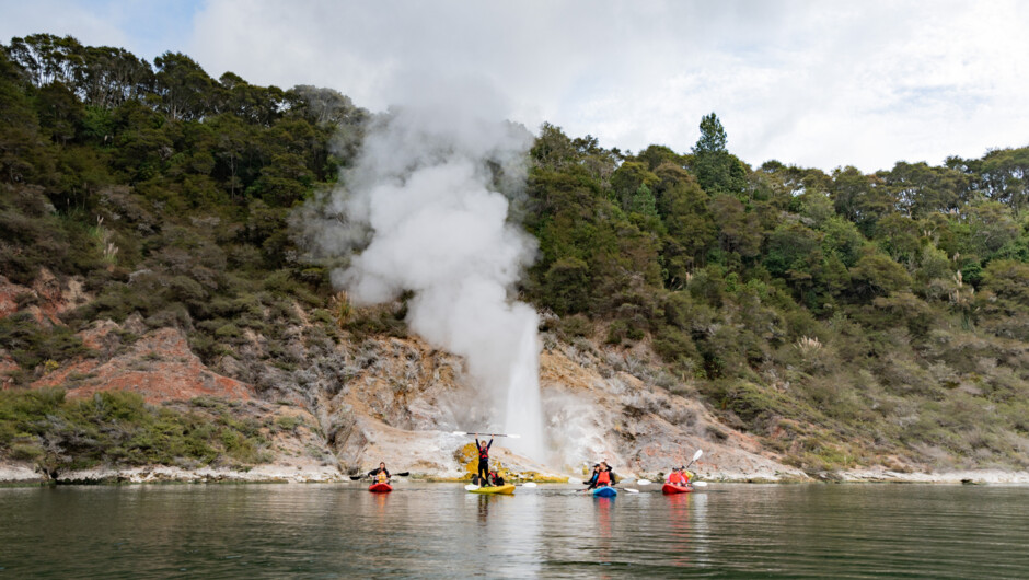 Explore the natural wonders of the world's youngest geothermal system at Waimangu Volcanic Valley on this spectacular and immersive fully guided walking and kayaking tour. Your personal and expert guide will lead you through the valley past the boiling and steaming lakes down to Lake Rotomahana where you will take to the waters by kayak. Paddling over the historic Pink and White terraces now buried in the lake you will kayak to incredible fumaroles on the steaming cliffs and the location of geysers which regularly steam on some trips. This incredible guided tour has been designed to create an amazing geothermal tour for all customers to experience the natural beauty of land and water breathing together.