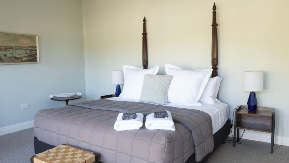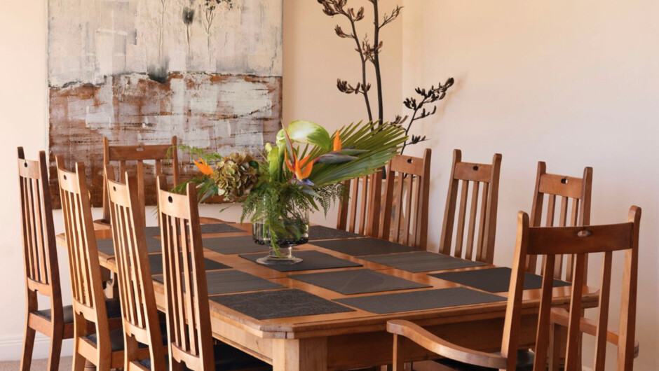 This single-level home sleeps up to 13 guests across six bedrooms, featuring four super king beds, two queen beds, and one single bed, making it perfect for large groups attending nearby events. Spacious entertaining areas keep all guests entertained with amenities like a spa pool, full-size snooker table, and golf chipping greens. The open-plan kitchen and multiple dining areas create the ultimate indoor-outdoor flow. This unique setting instantly gives you that 'on holiday' feeling. The layout allows for social time while also accommodating those who prefer to retire to their rooms. Quality linen and comfortable beds ensure a relaxed stay.
