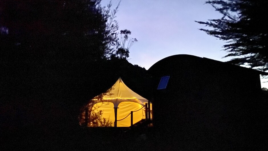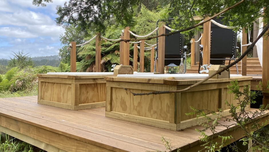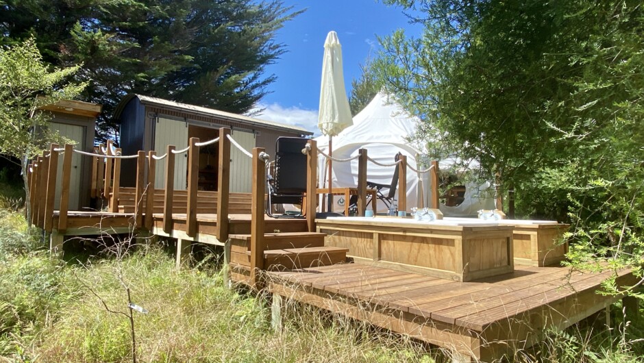Looking for a special place to share some special time with a special someone? This is it. Classy, private and unique. A three levelled deck hugs the contour of the land. Cocoon yourselves in our 5m Lotus Belle Hybrid deluxe tent with a wood stove for the cooler months. Two outdoor bathtubs grace the lower deck and a self catering kitchen and bathroom hut complete the amenities. Powered by a 24v solar power system, gravity fed spring water and a composting toilet, Treetop Glamping offers an off-grid low footprint eco experience. A personally tailored horseback adventure can be added to enhance your clamping experience.