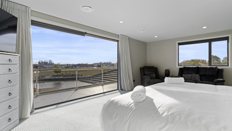 The large kitchen overlooks the first living area, including the dining space, heated by a log burner and heat pump for all-year comfort. A separate living area alongside features a cosy gas fireplace. Both rooms fully open to the outdoors via bi-fold doors to the lawn, flowing down to the jetty and canal. With all-day sun, you can relax and watch the kids swim and kayak from the spacious decking and seating area or pull your boat or jet ski up directly outside the home. The third living space is set up as a theatre room. Additionally, there is a laundry, main bathroom, and two double bedrooms on the main lower floor. Upstairs, are the remaining four spacious bedrooms and a bathroom. The master suite also has it's own spacious ensuite.