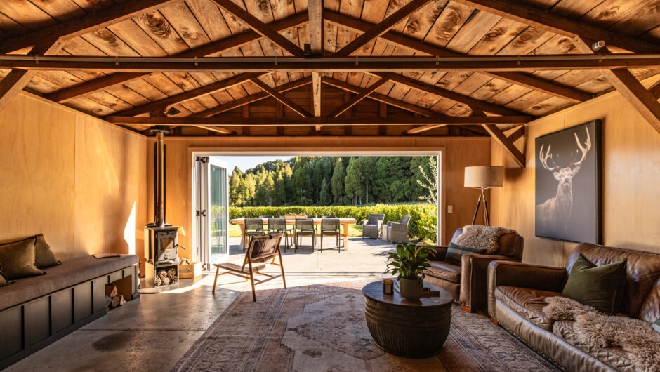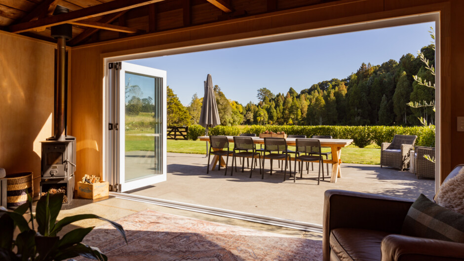 Step inside the main cabin, where expansive folding glass doors open to breathtaking forest views, seamlessly blending the warmth of the timber interior with the tranquillity of nature. There are indoor and outdoor kitchens, plus a separate bathroom outhouse. Just beyond, a spacious lawn stretches out, inviting barefoot strolls, lawn games, or sinking into a bean bag with a good book. For the ultimate unwind, soak in the twin outdoor baths or refresh under the open-air shower. A grand outdoor fireplace is the heart of the retreat - where stories unfold, s’mores (a sweet snack) are enjoyed, and memories are made.