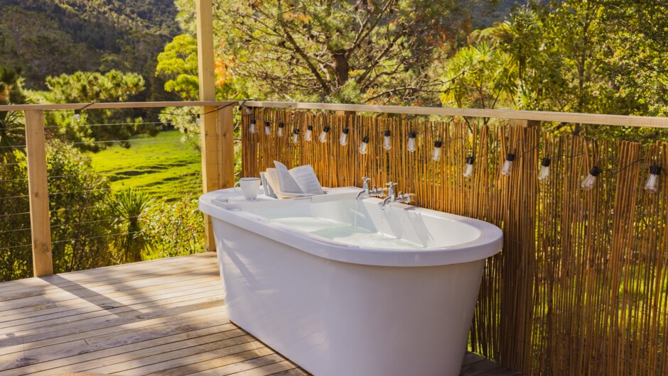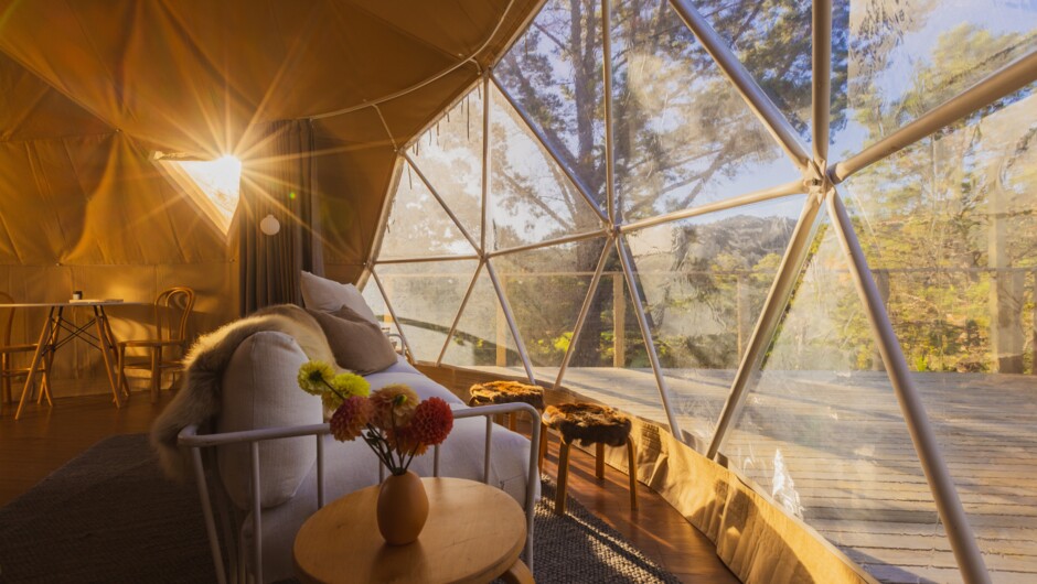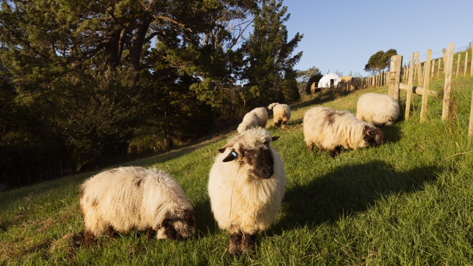 The space includes a separate bathroom and kitchen 'shed,' just a few steps from the dome, all encircled by a purpose-built deck. And for ultimate relaxation, an outdoor bath with a view. Enjoy the melodies of native birds like tūī, kākā, and pīwakawaka, rosella, and the occasional kookaburra. Just beyond the dome, friendly Valais Blacknose sheep and Miniature Highland cows are always eager for a pat. As the day winds down, don’t miss the magical sunsets. A telescope offers a stunning view of the starry sky, while ruru/ moreporks serenade you to sleep and the nearby stream gently bubbles away.